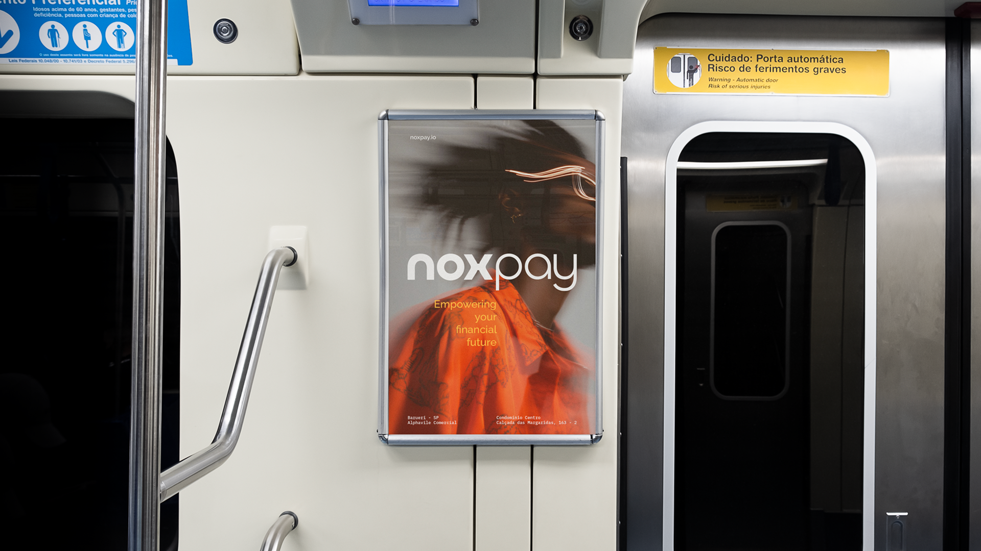 A proposta foi criar uma identidade visual mais vibrante, sólida e replicável — capaz de sustentar o reposicionamento da marca em todos os seus pontos de contato. A direção criativa partiu de metáforas visuais ligadas à velocidade e fluidez: uso de fotografia borrada para sugerir movimento, uma paleta quente e energética, grids mais bem definidos e uma aplicação de marca que reforçasse tanto o dinamismo quanto a precisão da NoxPay. O novo sistema visual tornou possível destacar o caráter tecnológico da marca sem perder acessibilidade ou clareza.
